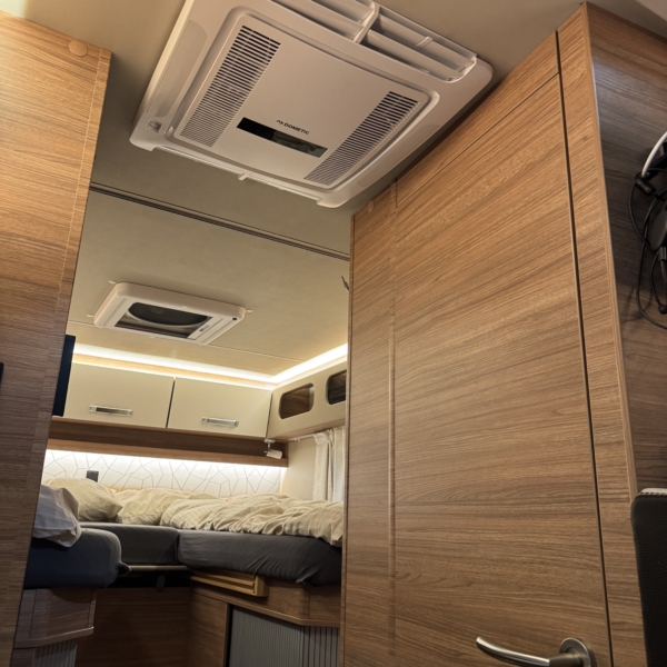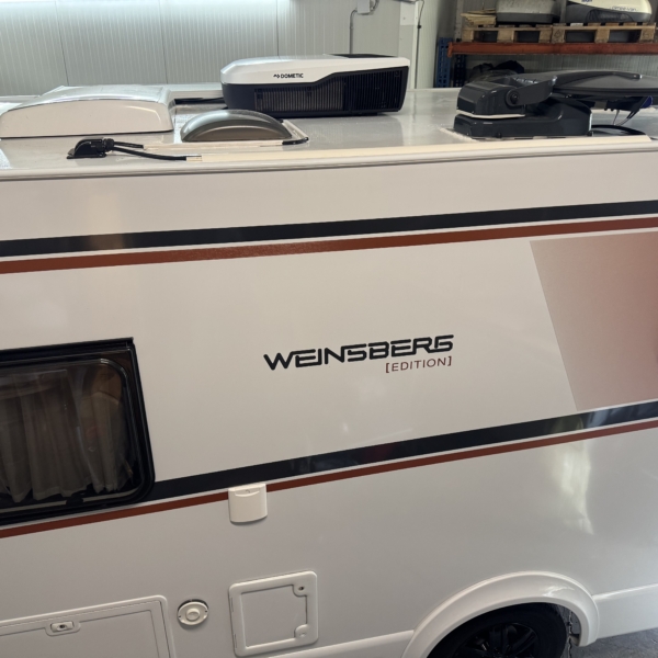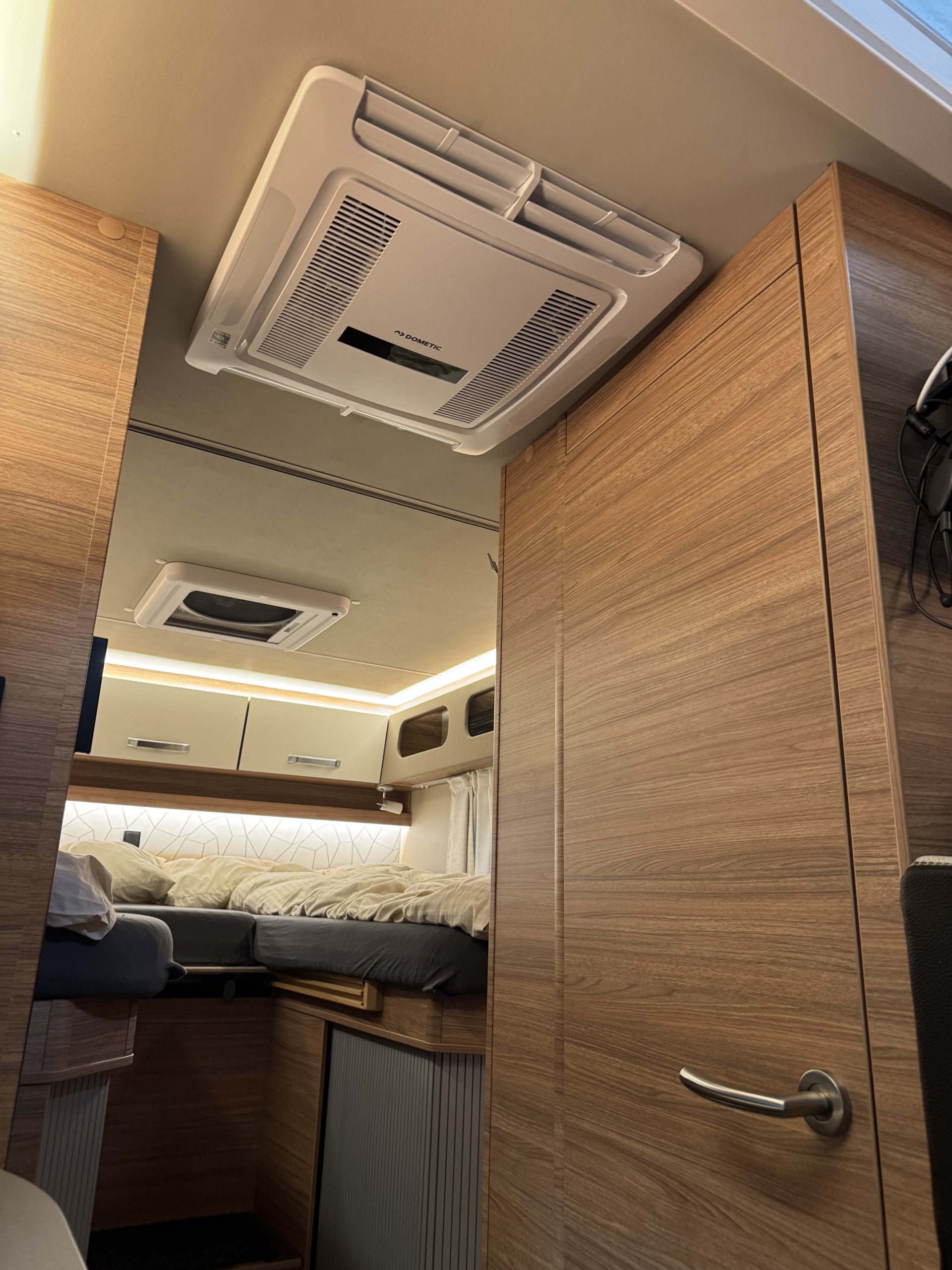 Een Dometic FJX7 2200 geplaatst op een Weinsberg CaraCompact Edition. Voor het keukenblok een nieuwe opening aangebracht. Verstevigd met een houten frame en de stroomkabel volledig uit het zicht aangebracht.