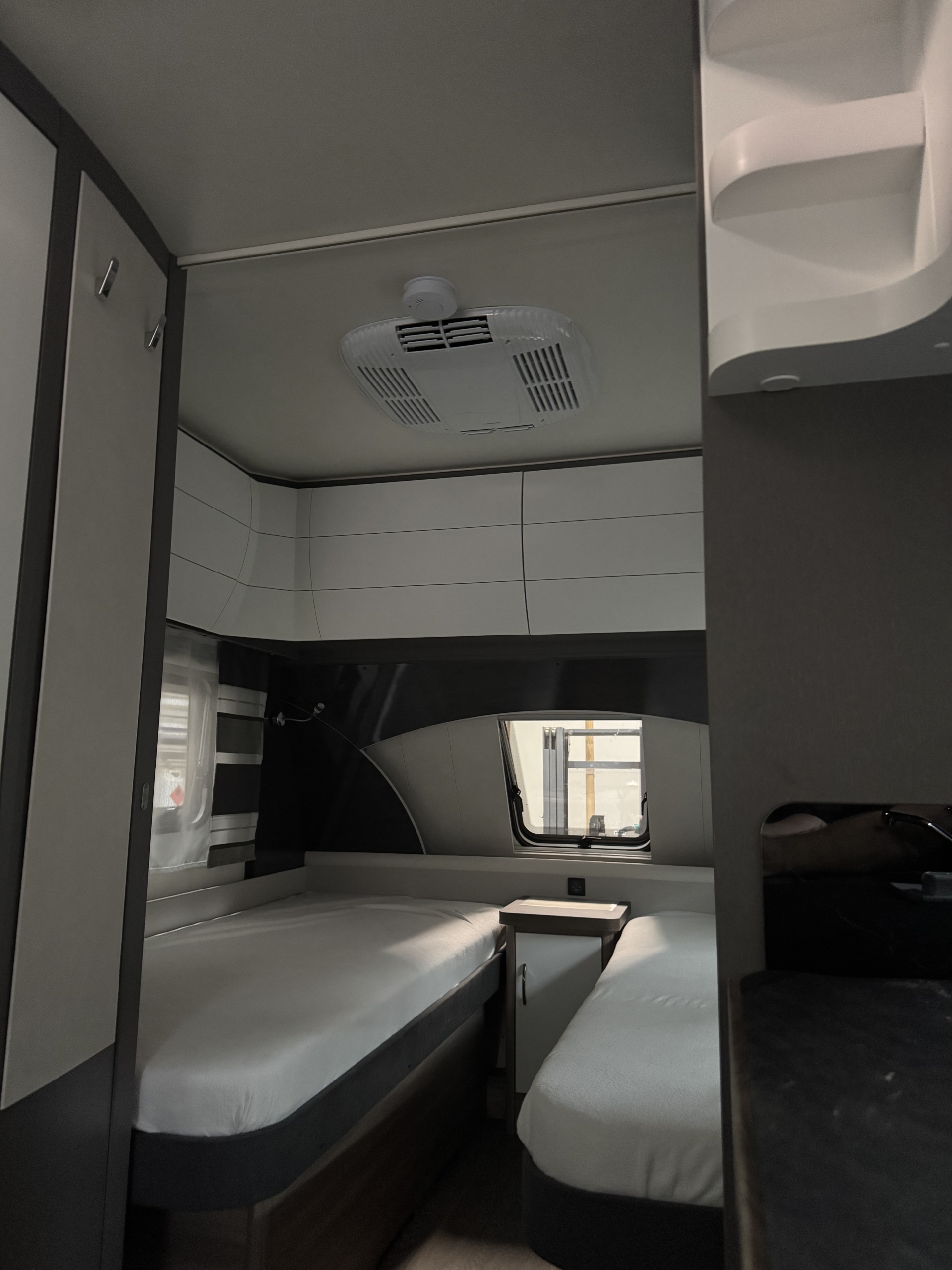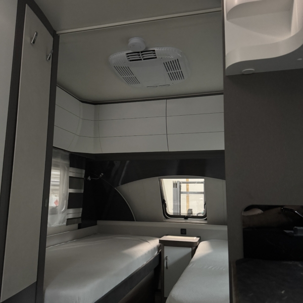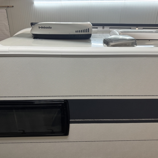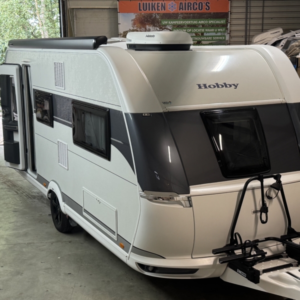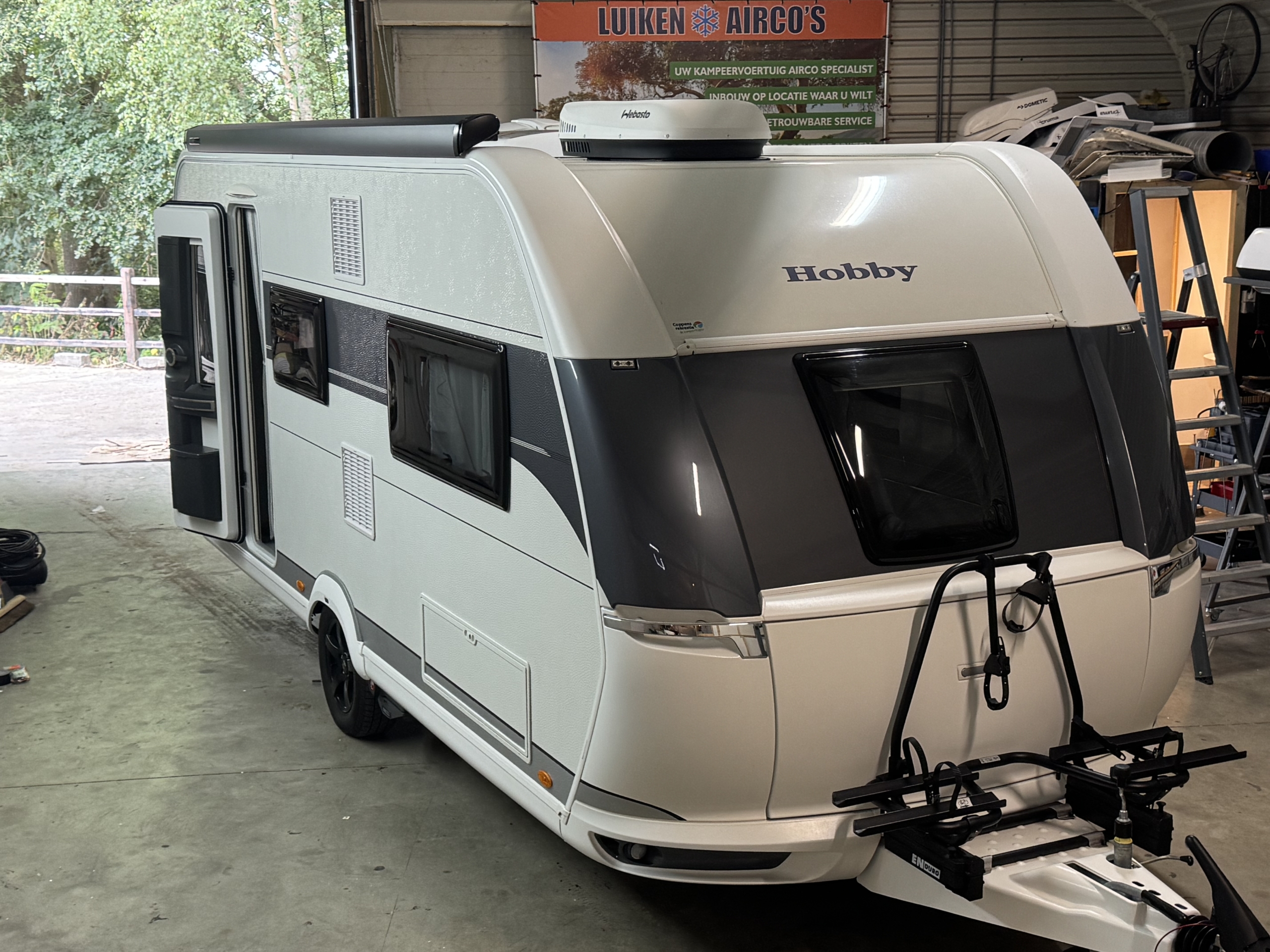 Een Webasto Cool Top Trail 24 geplaatst op een Hobby 495 UL. Hier is door de kant gekozen voor het voorste dakraam ivm weinig kogeldruk.