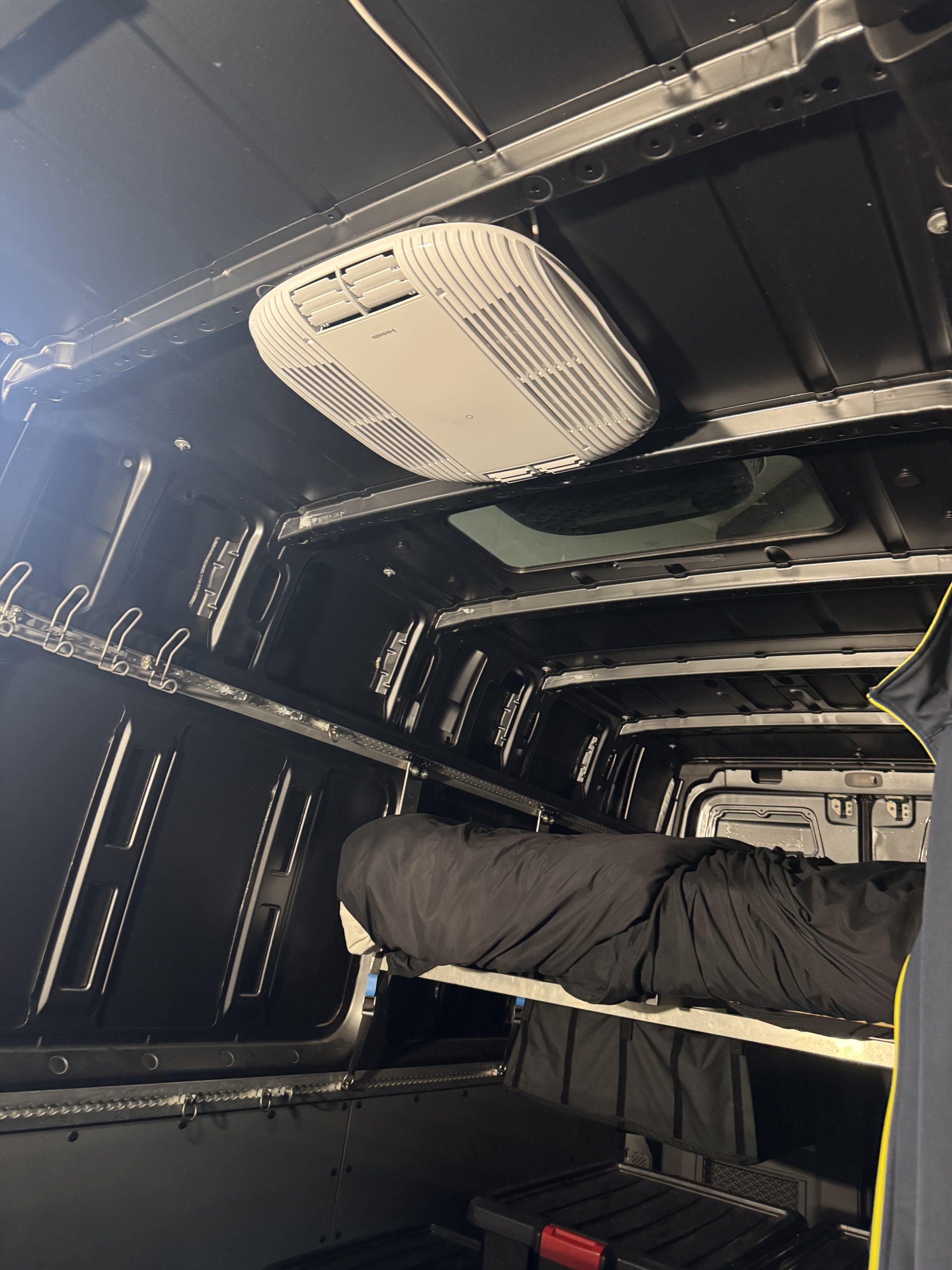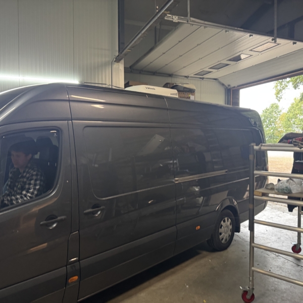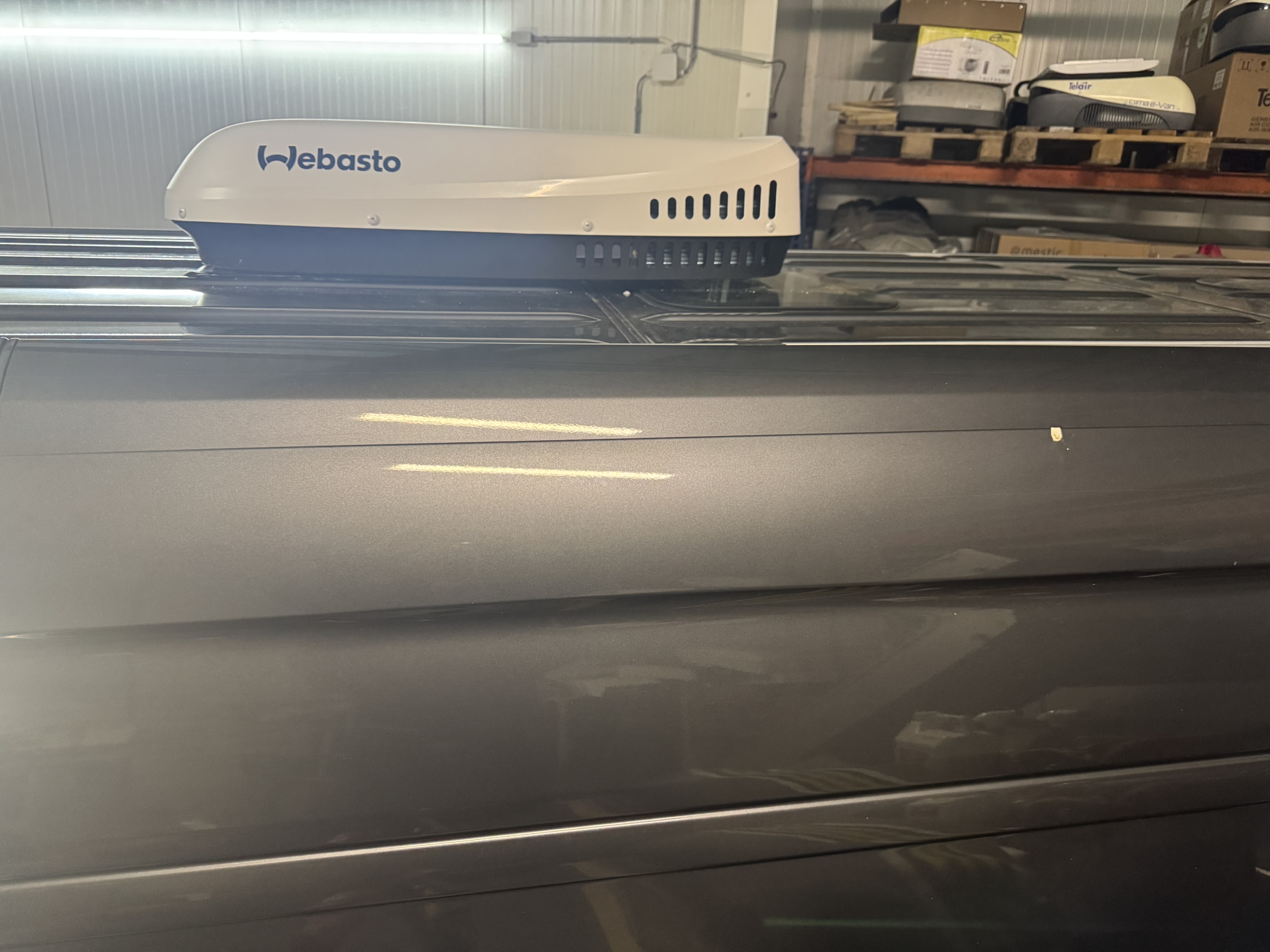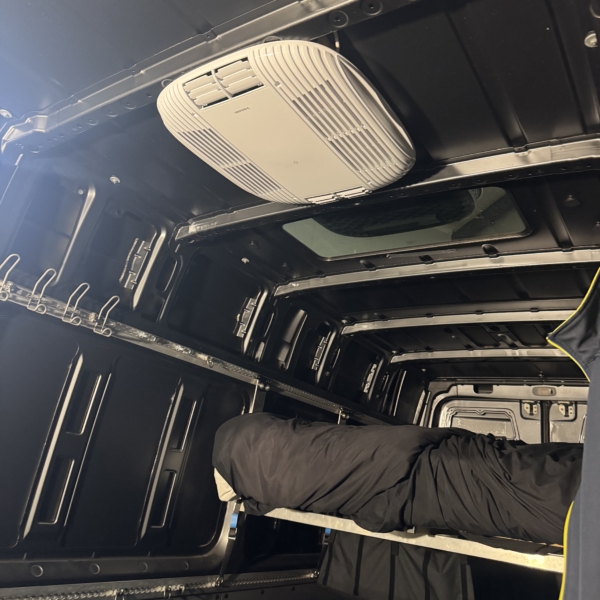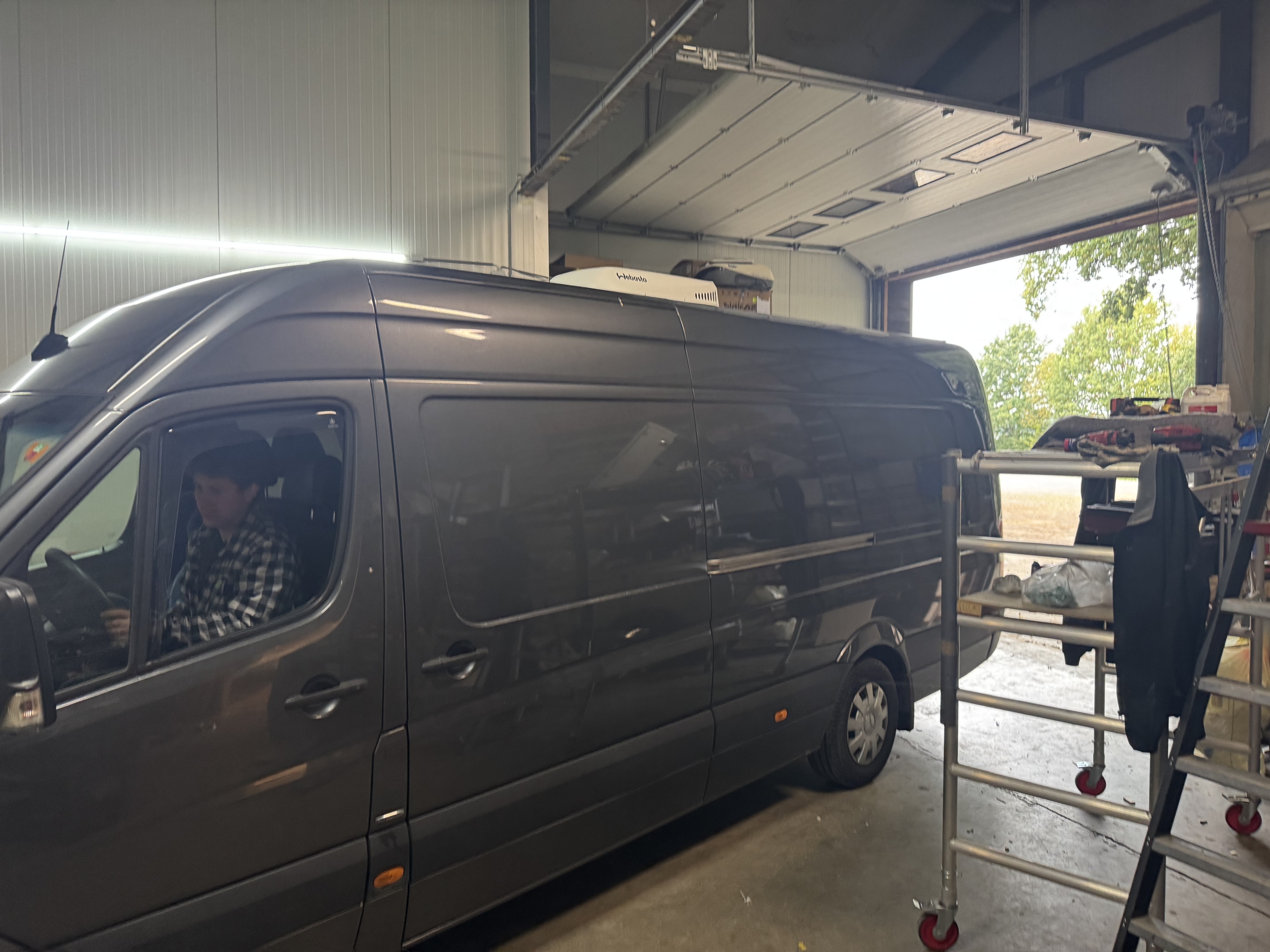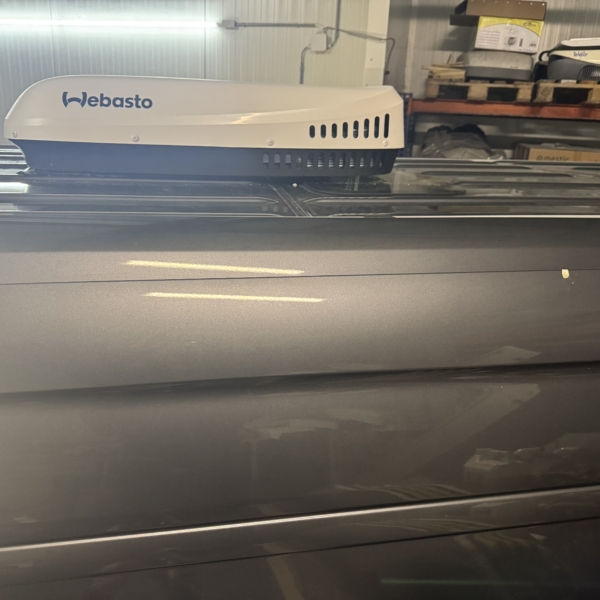 Een Webasto Cool Top Trail 24 geplaatst op een Mercedes Benz Sprinter. In het midden van de bus een nieuwe opening aangebracht.