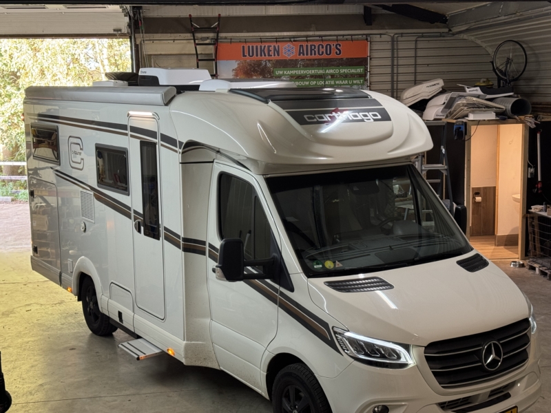 Een Truma Aventa Compact Plus 2G geplaatst in een Carthago C-Tourer. In het midden van de camper een Maxxfan verplaatst naar het venster boven het bed.
