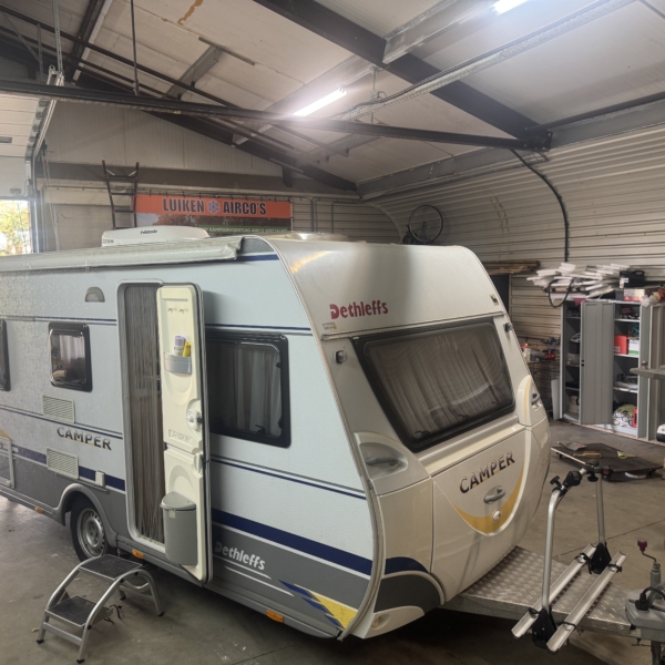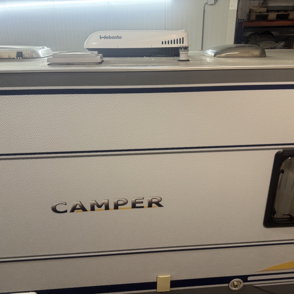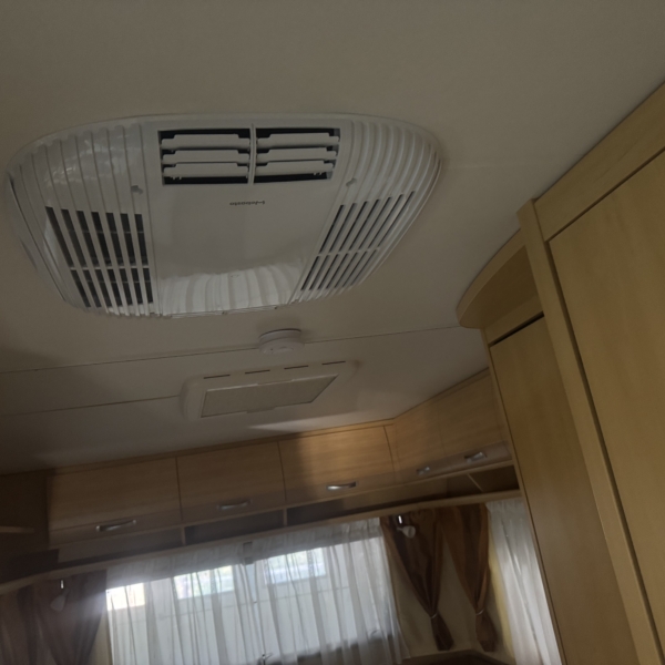 Een Webasto Cool Top Trail 24 geplaatst op een Dethleffs Camper. In het midden van de caravan een nieuwe opening aangebracht. Deze verstevigd met een houten frame. De voedingskabel door de dakconstructie aangebrach.