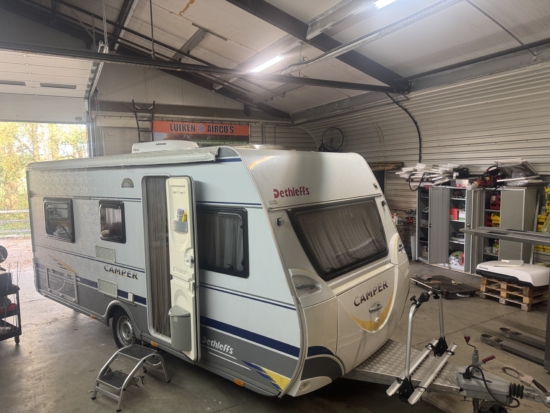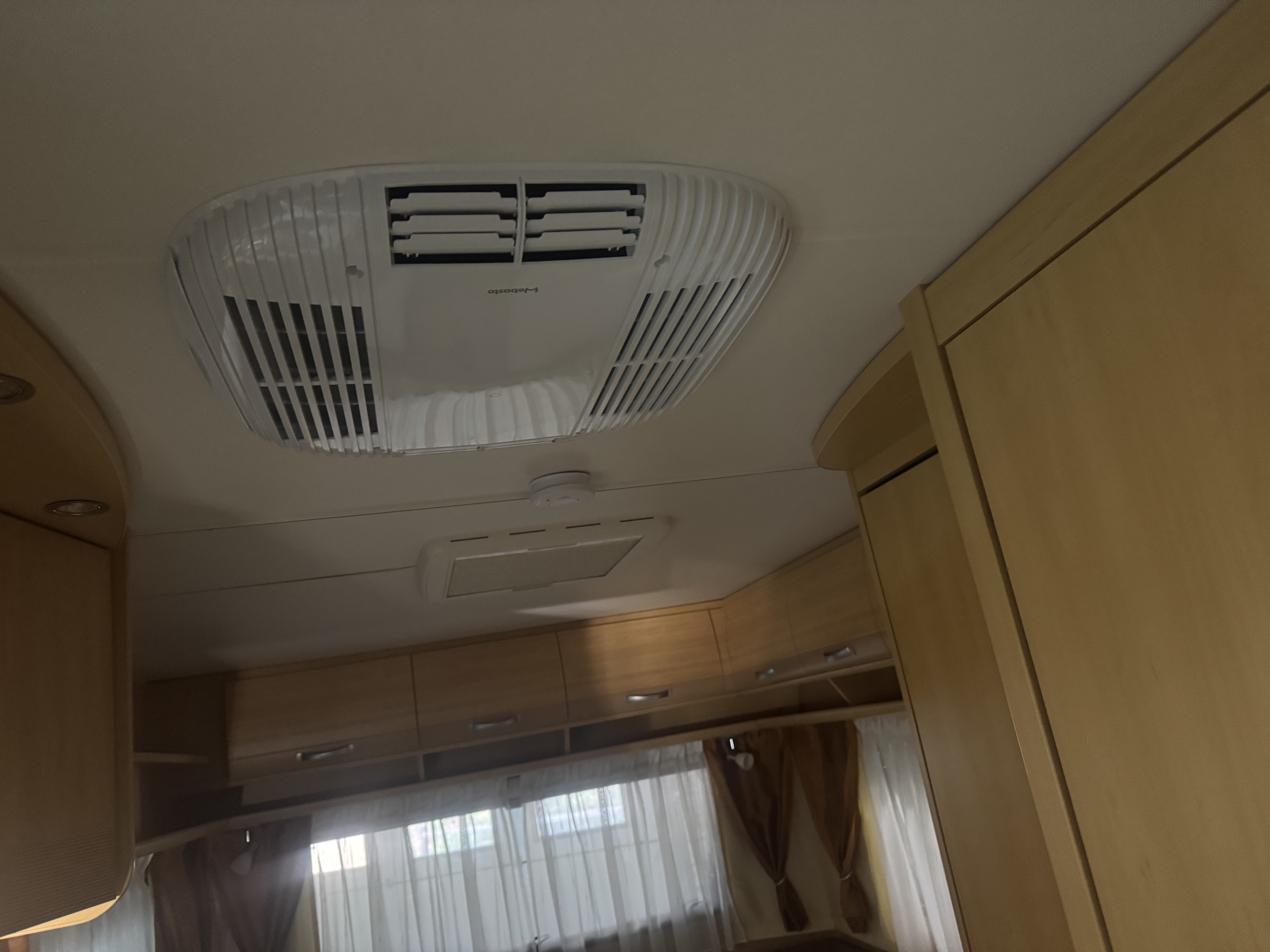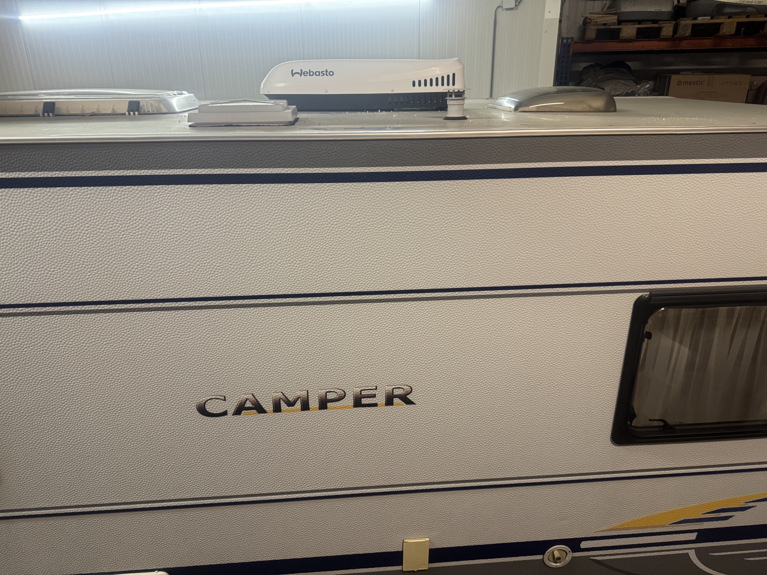 Een Webasto Cool Top Trail 24 geplaatst op een Dethleffs Camper. In het midden van de caravan een nieuwe opening aangebracht. Deze verstevigd met een houten frame. De voedingskabel door de dakconstructie aangebrach.