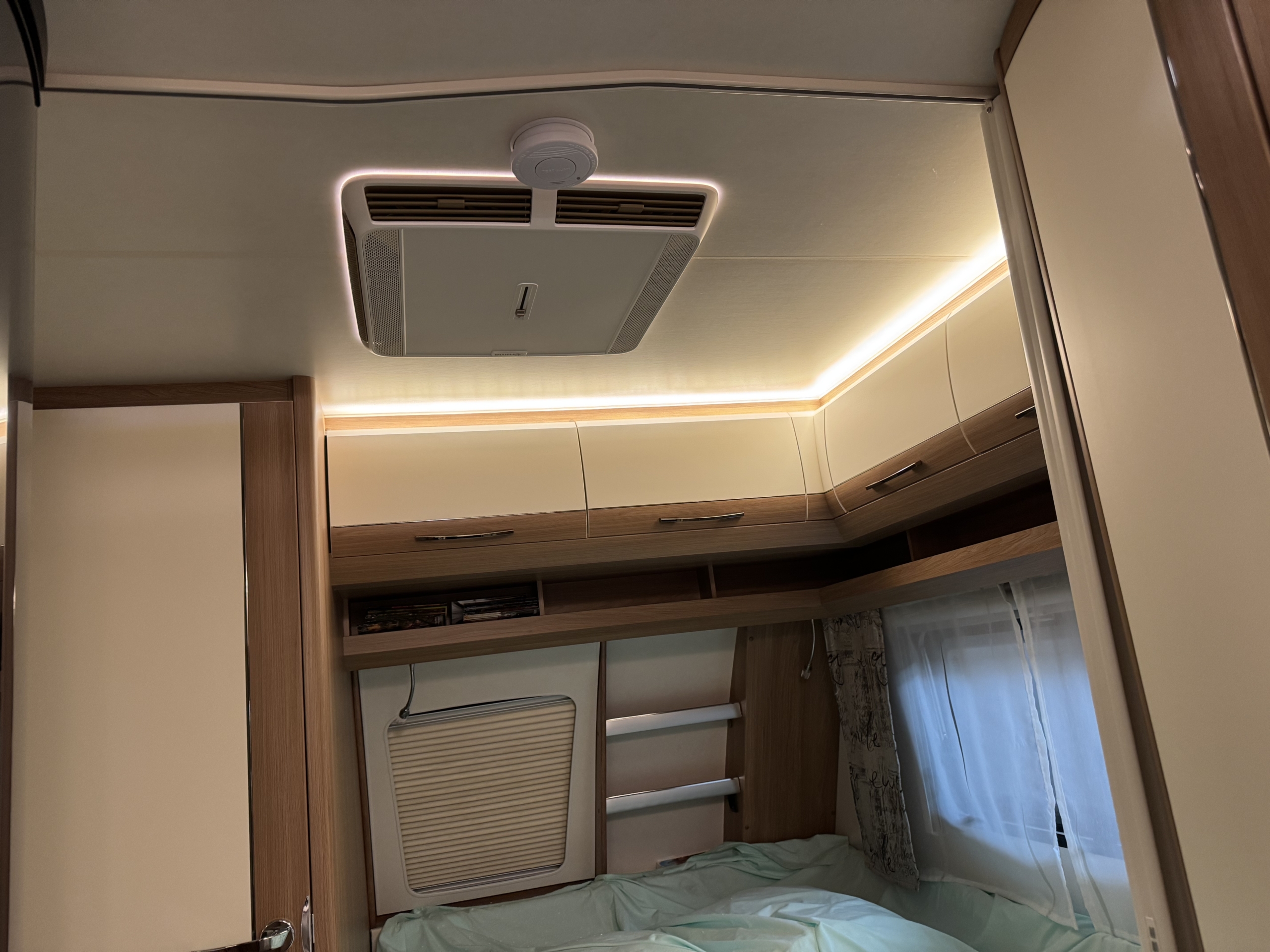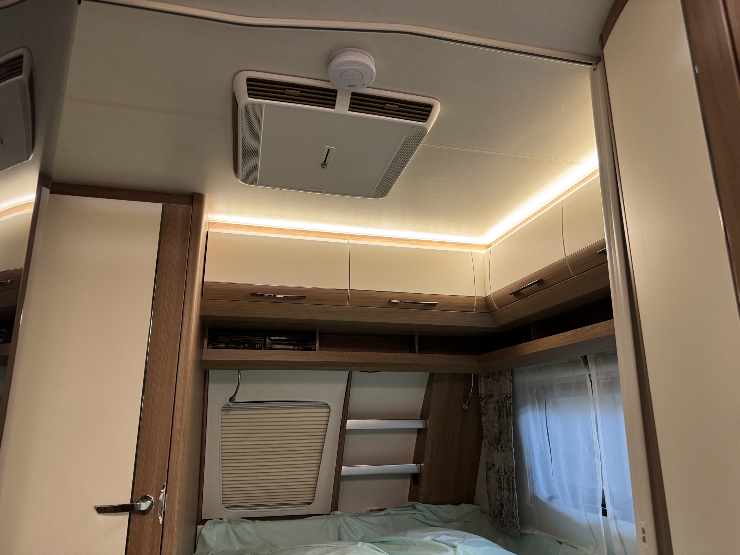 Het voorste dakraam verwijderd en de dakairco er voor terug gezet. Als altijd is de stroomkabel volledig uit het zicht aangebracht.