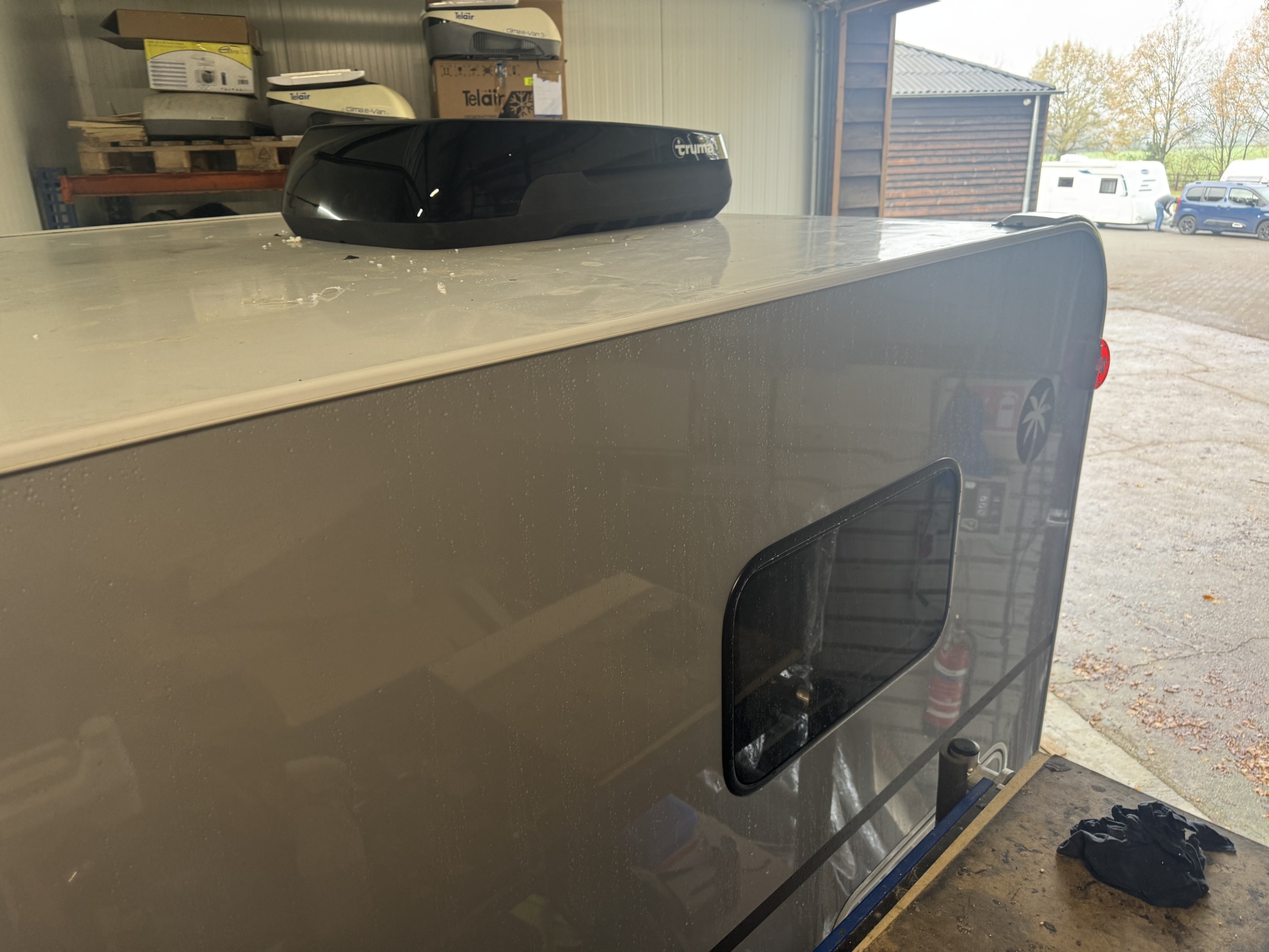 Het achterste dakraam verwijderd, houten frame geplaatst en als altijd de stroomkabel volledig uit het zicht aangebracht en de dakairco ervoor terug geplaatst.
