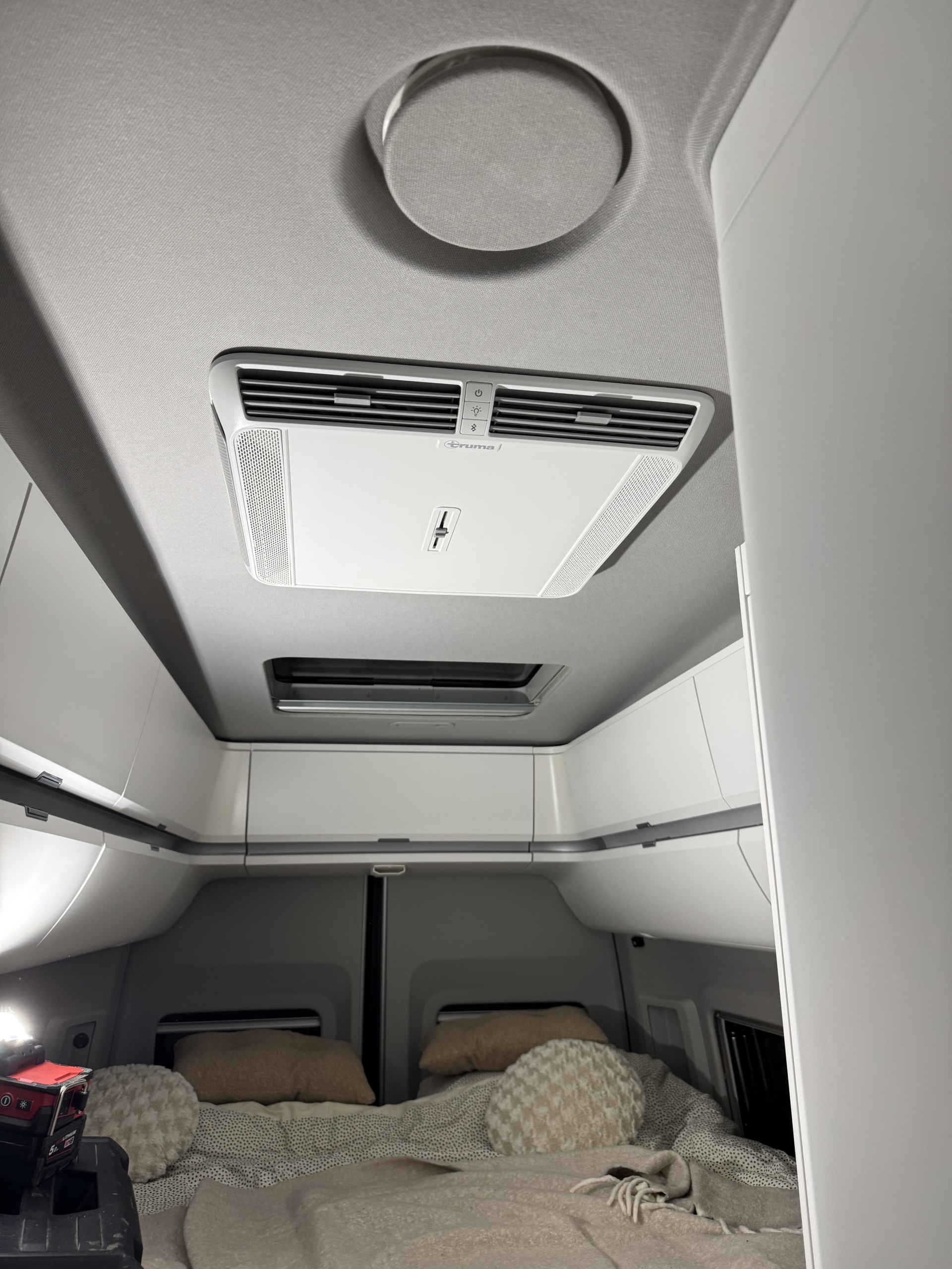 In het midden van de camper een nieuwe opening gemaakt en verstevigd met een houten frame. De stroomkabel volledig uit het zicht aangebracht.