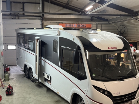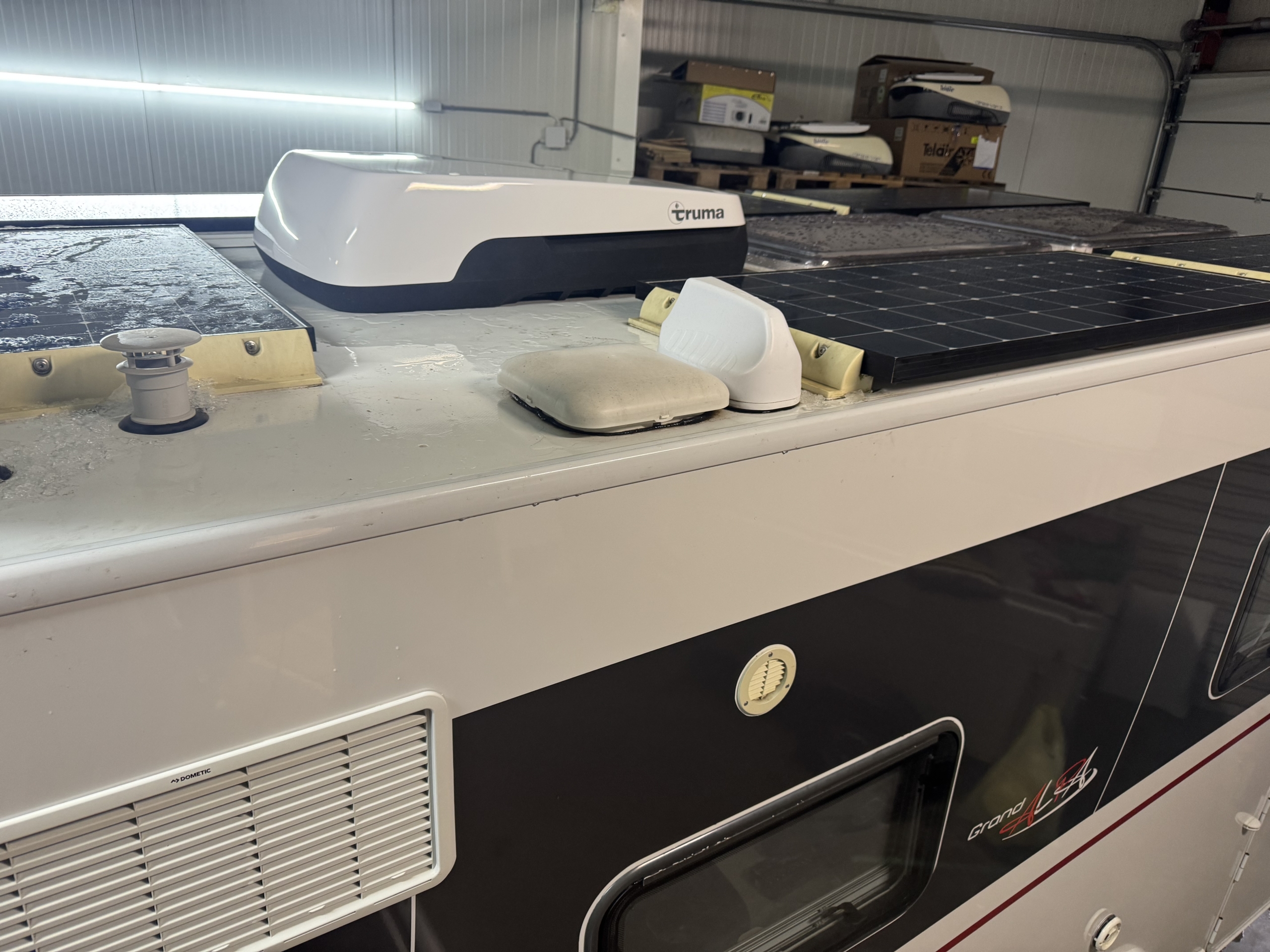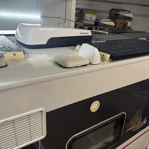 Een Truma Aventa Comfort 2G geplaatst op een Dethleffs Grand Alpa I 7820-2. In het midden een Maxxfan De Luxe verwijderd en vervangen voor de Truma dakairco.