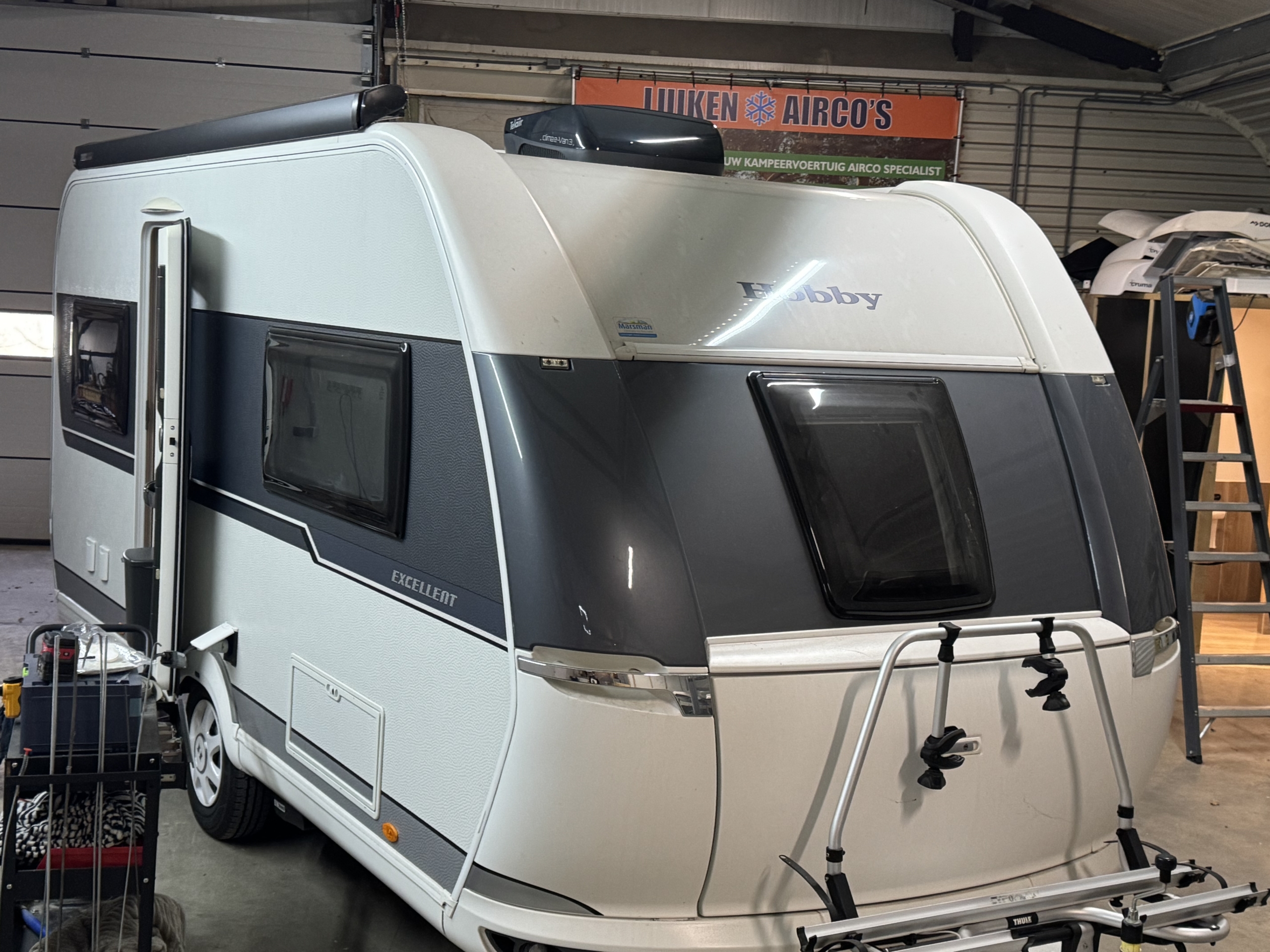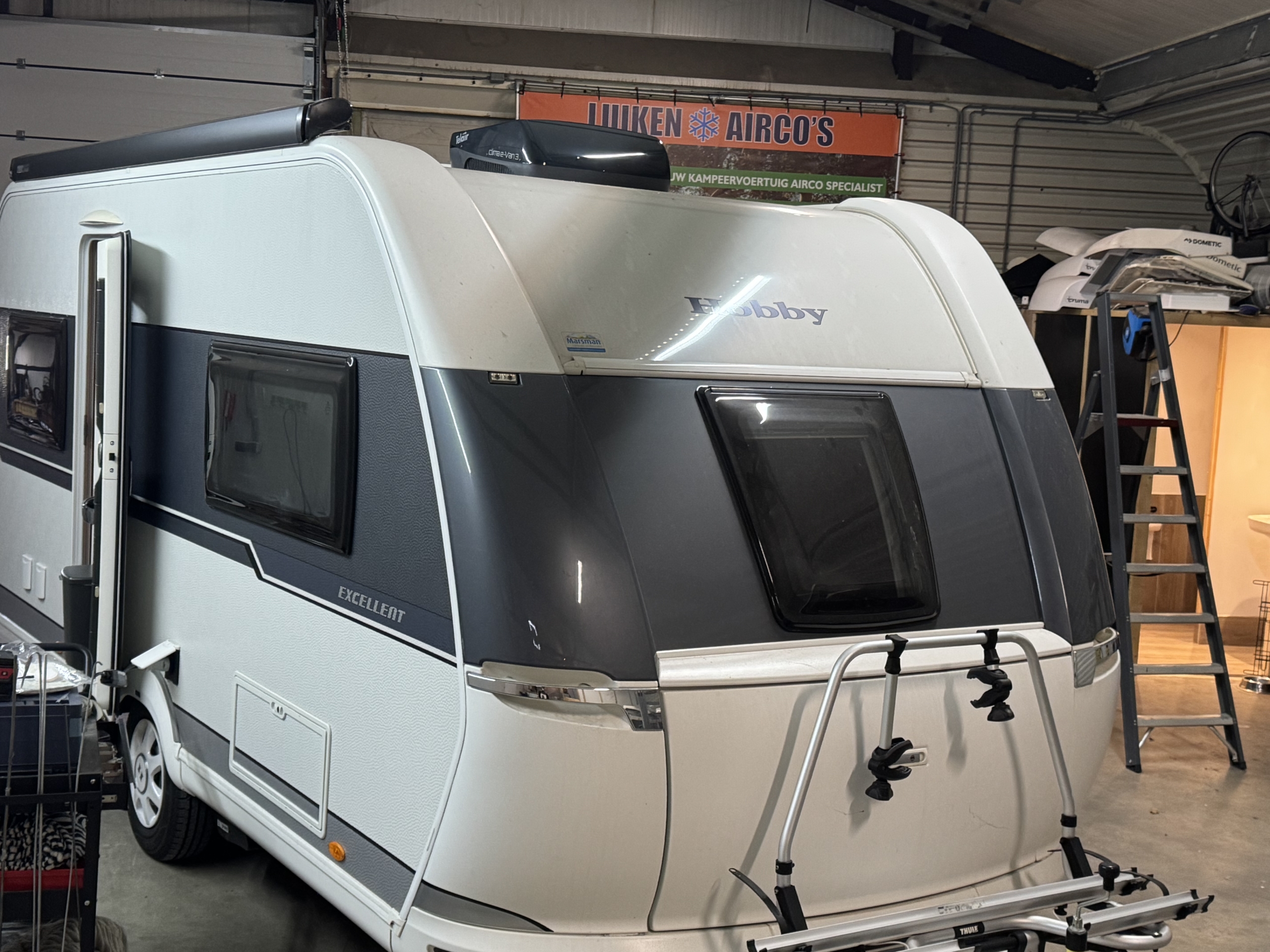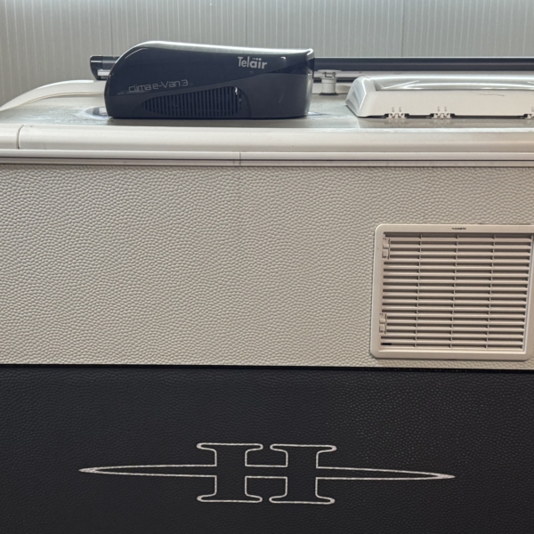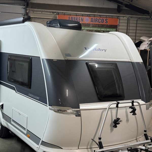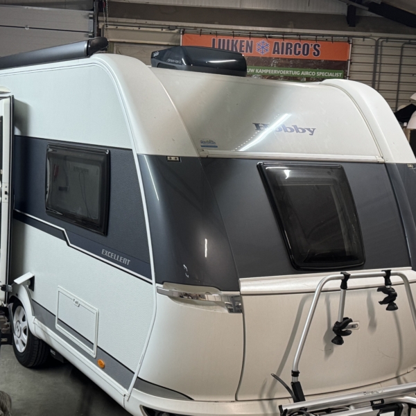 Een Telair Clima E-Van 7400 Black geplaatst op een Hobby Excellent 460 UFE. Het voorste dakraam uitgewisseld voor deze dakairco.