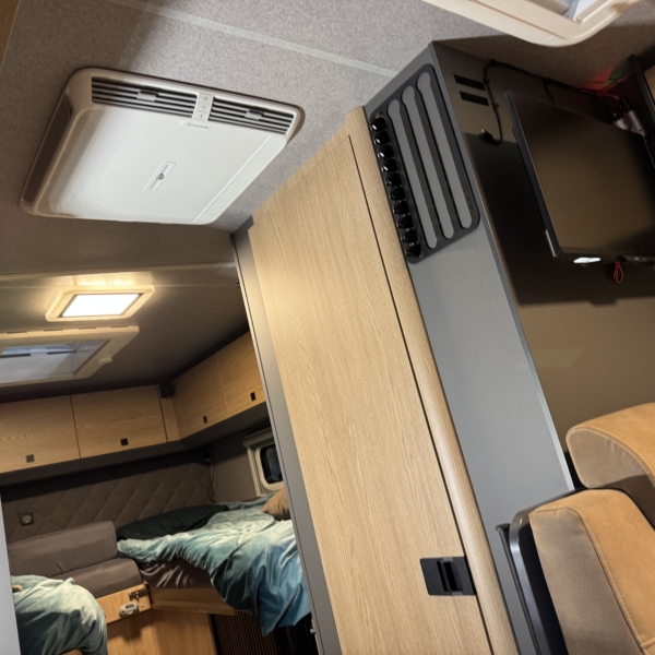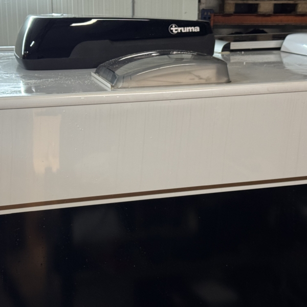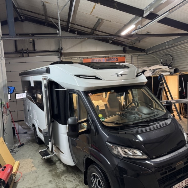Een Truma Aventa Comfort 2G Black geplaatst op een Hobby Nero T 710 GE. In het midden van de camper een nieuwe opening aangebracht en verstevigd met een houten frame.