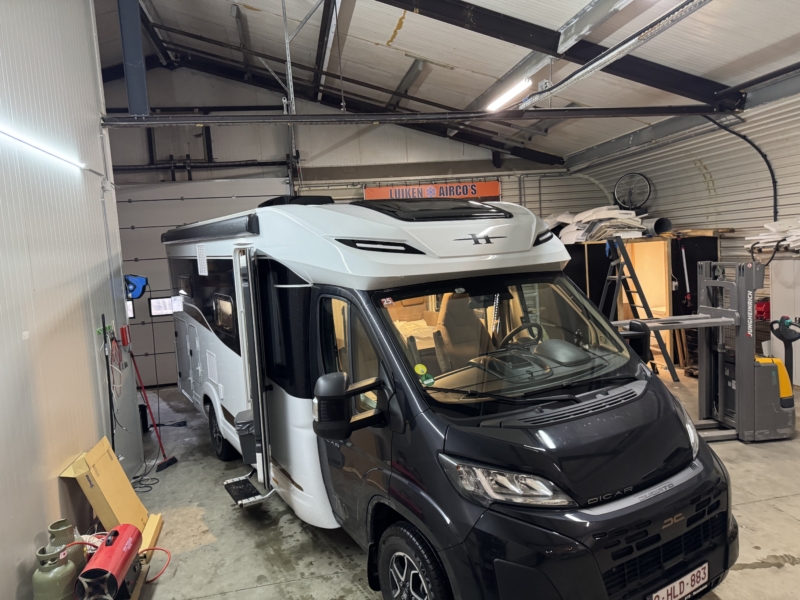 Een Truma Aventa Comfort 2G Black geplaatst op een Hobby Nero T 710 GE. In het midden van de camper een nieuwe opening aangebracht en verstevigd met een houten frame.