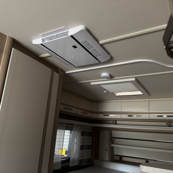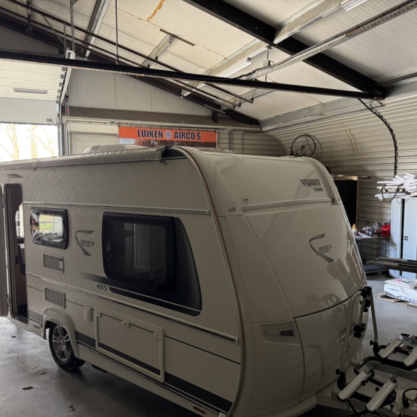 Een Telair Silent Plus 8100H geplaatst op een Fendt Bianco 465 Selection. In het midden van de caravan een nieuwe opening aangebracht.