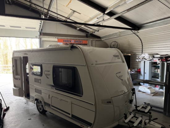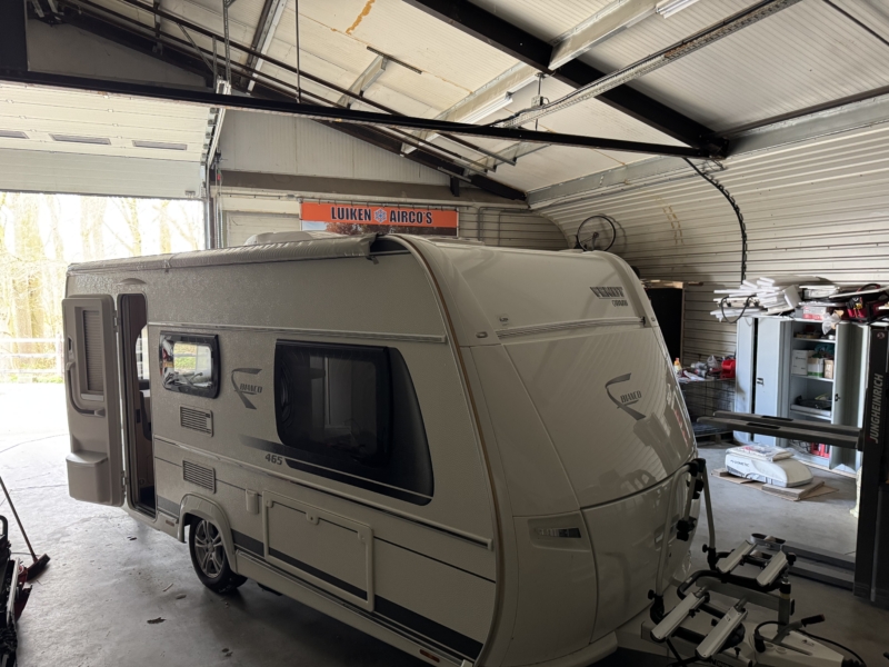 Een Telair Silent Plus 8100H geplaatst op een Fendt Bianco 465 Selection. In het midden van de caravan een nieuwe opening aangebracht.