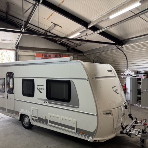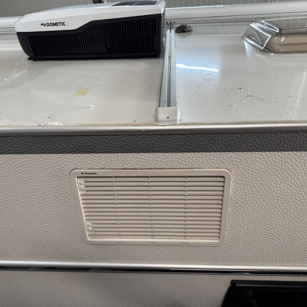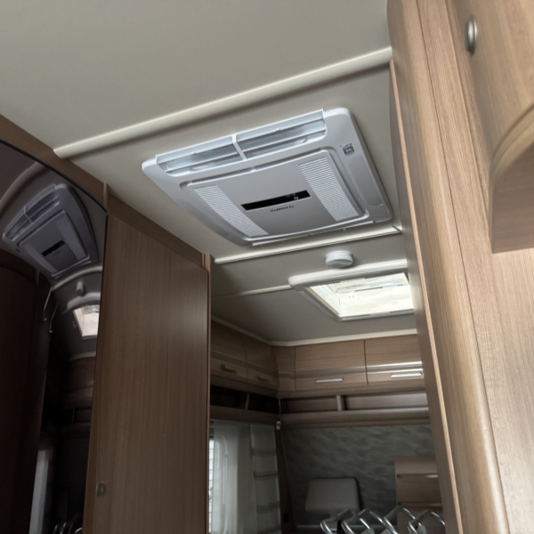 Een Dometic FJX7 2200 geplaatst op een Fendt Bianco 515. In het midden van de caravan een nieuwe opening aangebracht. De middelste dakdrager van de cassetteluifel moeten verleggen.