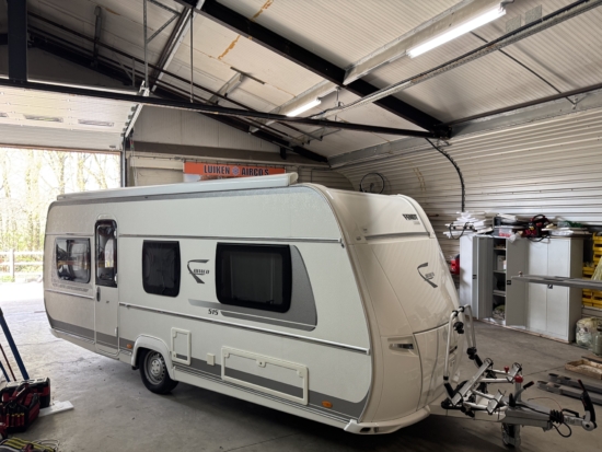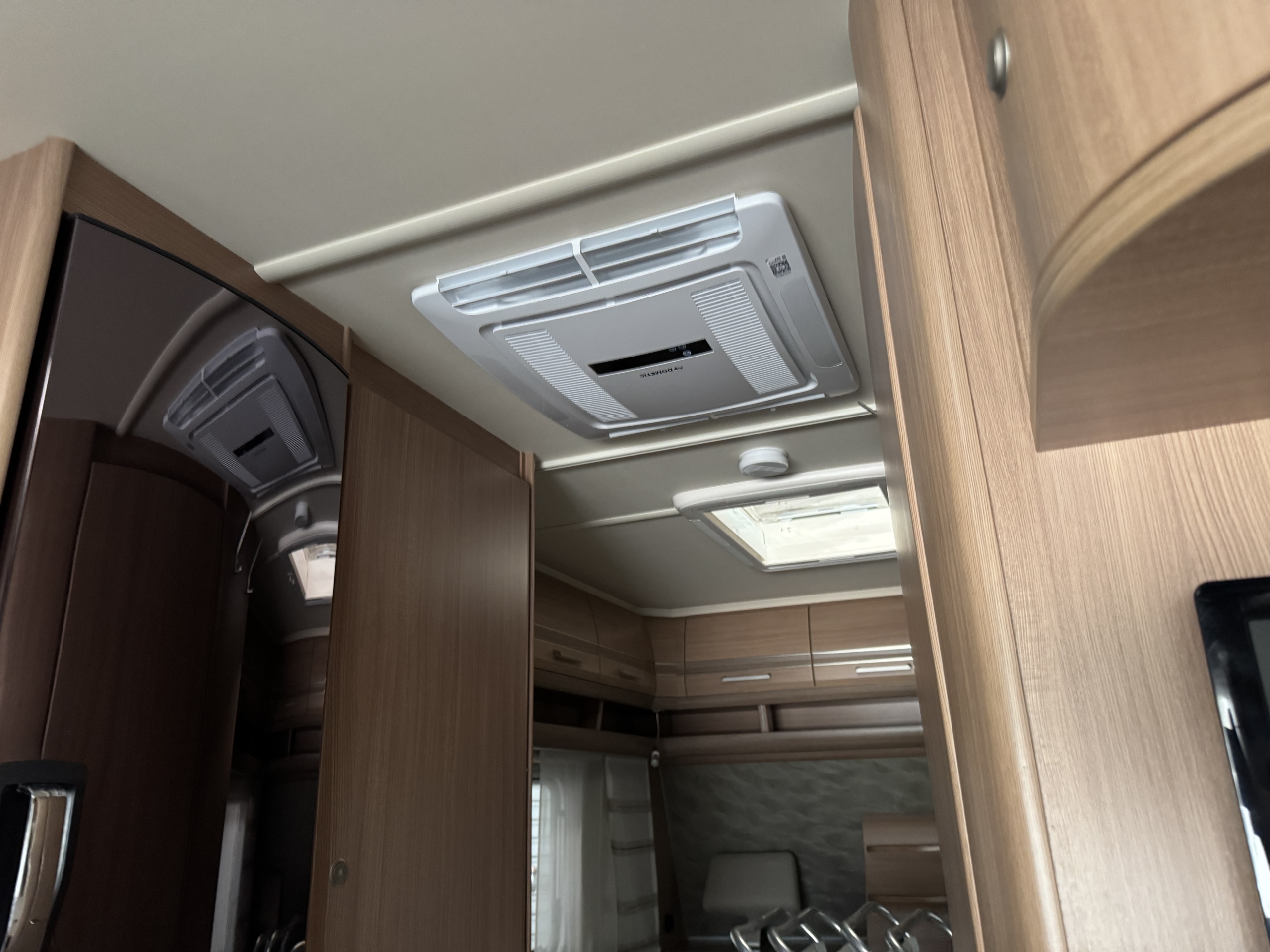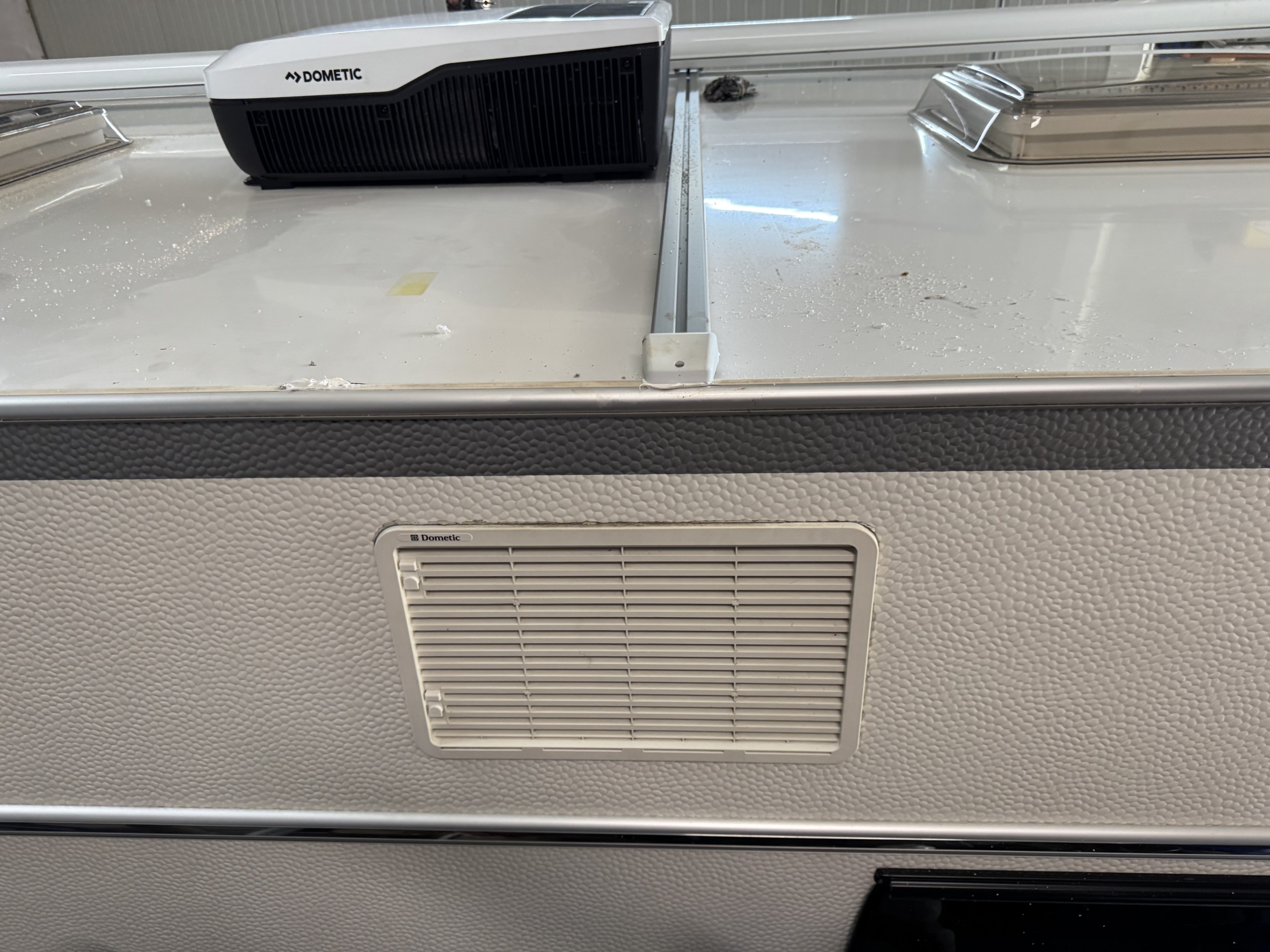 Een Dometic FJX7 2200 geplaatst op een Fendt Bianco 515. In het midden van de caravan een nieuwe opening aangebracht. De middelste dakdrager van de cassetteluifel moeten verleggen.