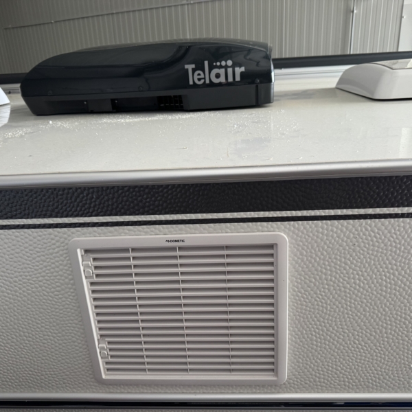 Een Telair Silent Plus 8100H Black geplaatst op een Fendt Saphir 515. Precies boven de as een nieuwe opening aangebracht. Een houten frame aangebracht voor de versteviging en de stroomkabel volledig uit het zicht aangebracht.
