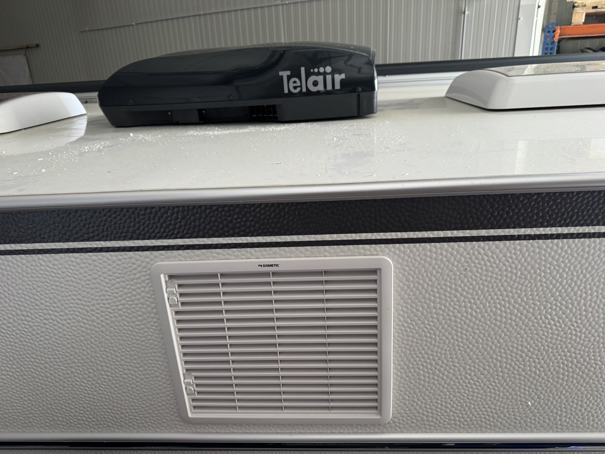 Een Telair Silent Plus 8100H Black geplaatst op een Fendt Saphir 515. Precies boven de as een nieuwe opening aangebracht. Een houten frame aangebracht voor de versteviging en de stroomkabel volledig uit het zicht aangebracht.