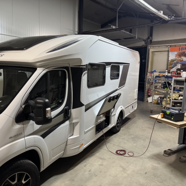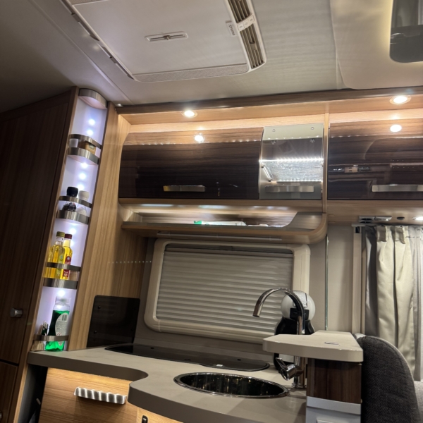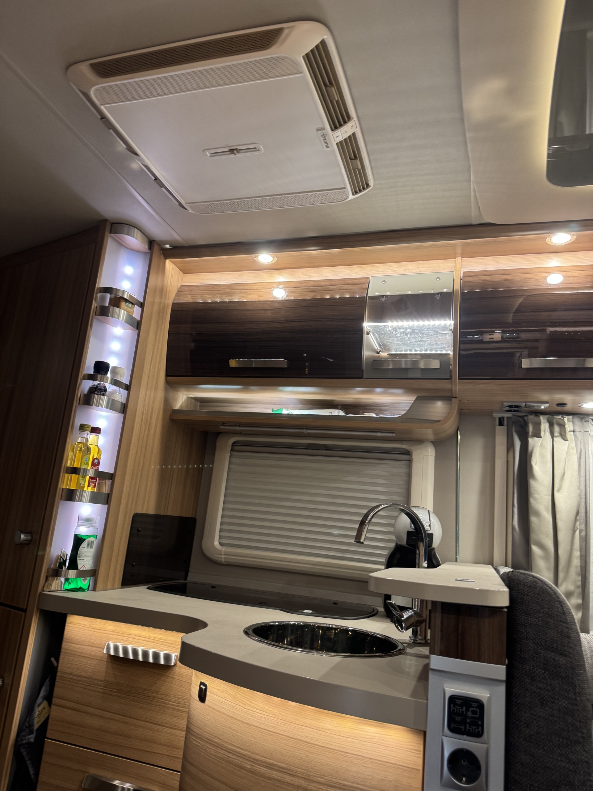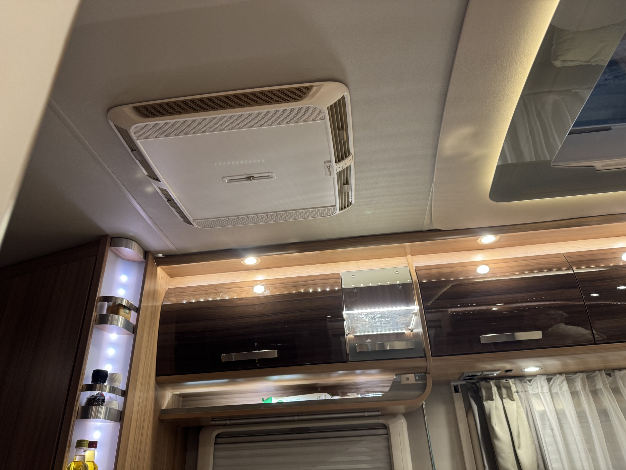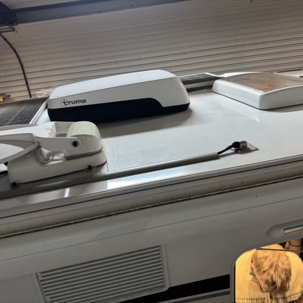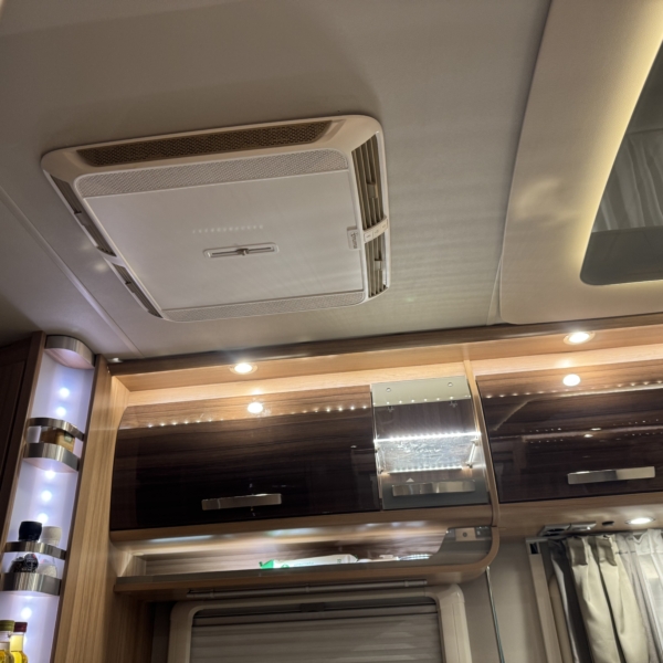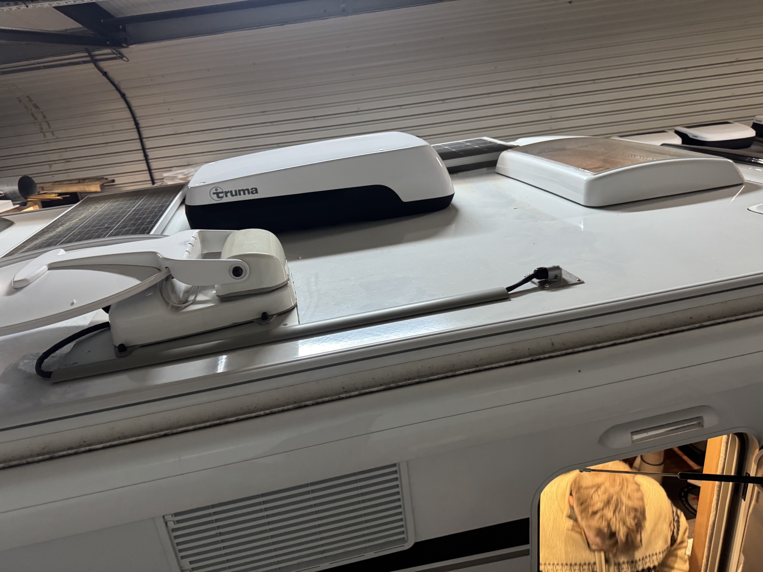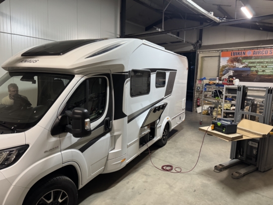 Een Truma Aventa Comfort 2G geplaatst op een Knaus Sun TI Platinum Selection. Net achter het grote dakraam een nieuwe opening aangebracht en de airco geplaatst. Opening is voorzien van een houten frame en de voedingskabel is door de dakconstructie aangebracht.