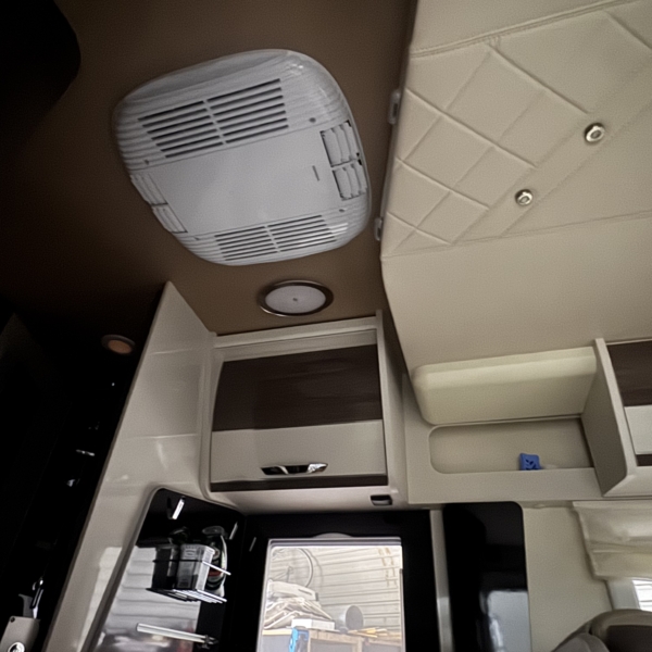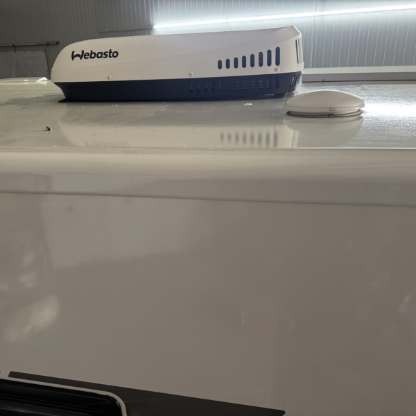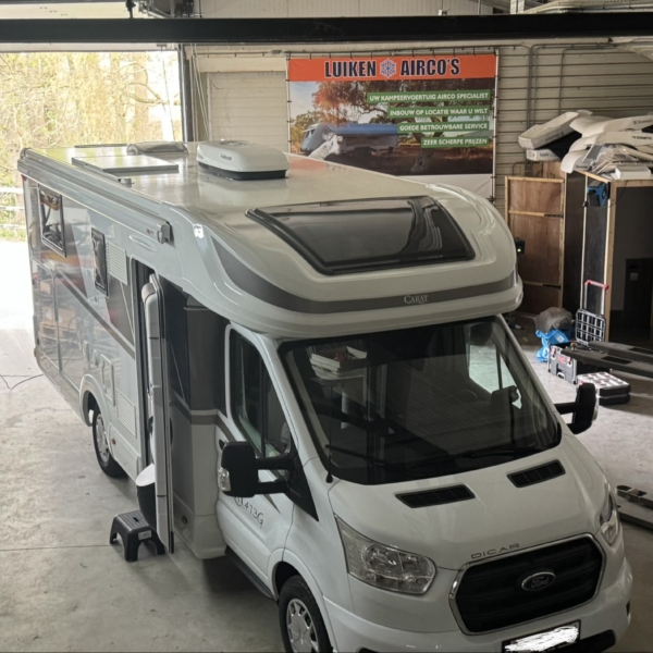 Een Webasto Cool Top Trail 24 geplaatst in een McLouis Carat 473G. Het dakraam boven de keuken vervangen voor de dakairco.