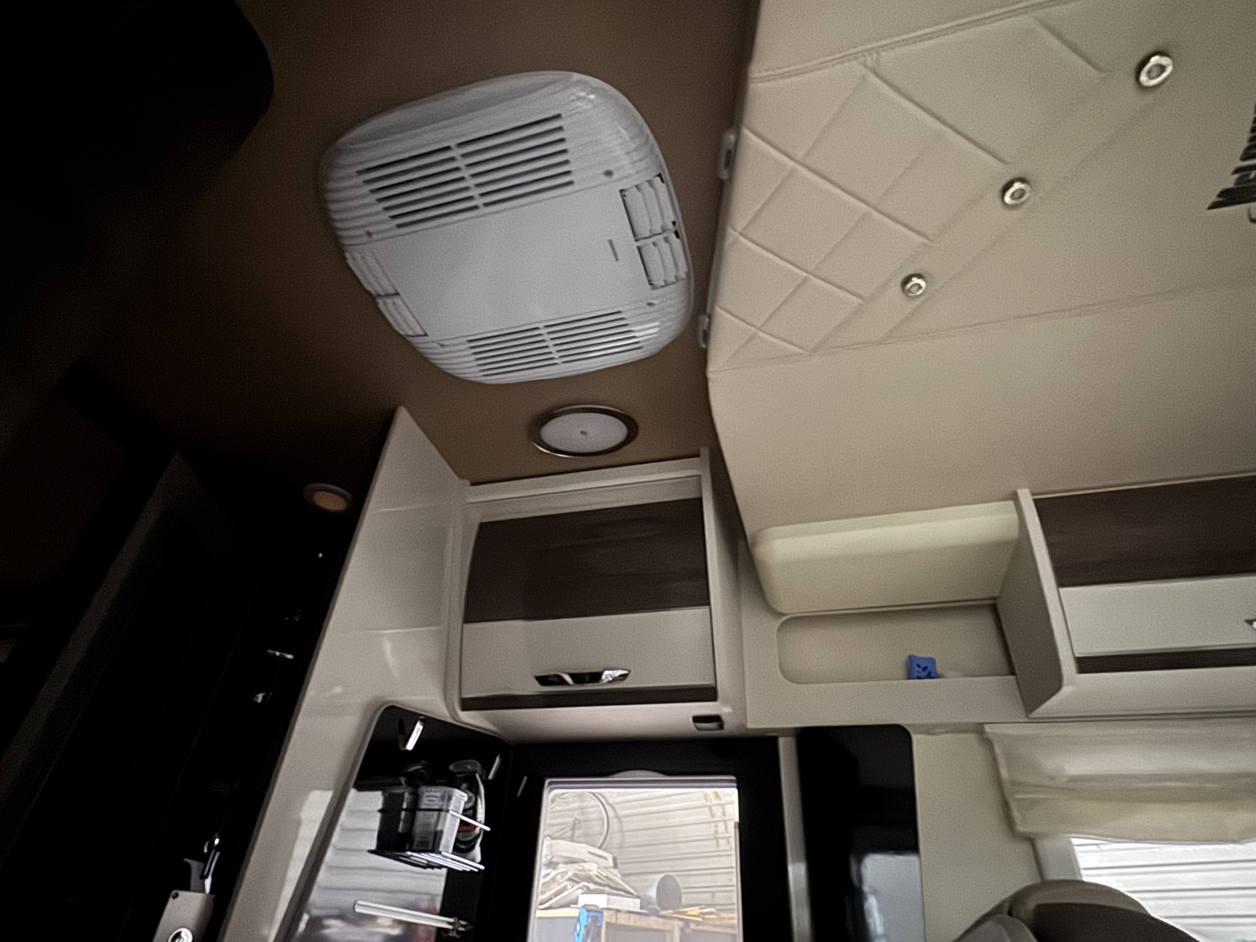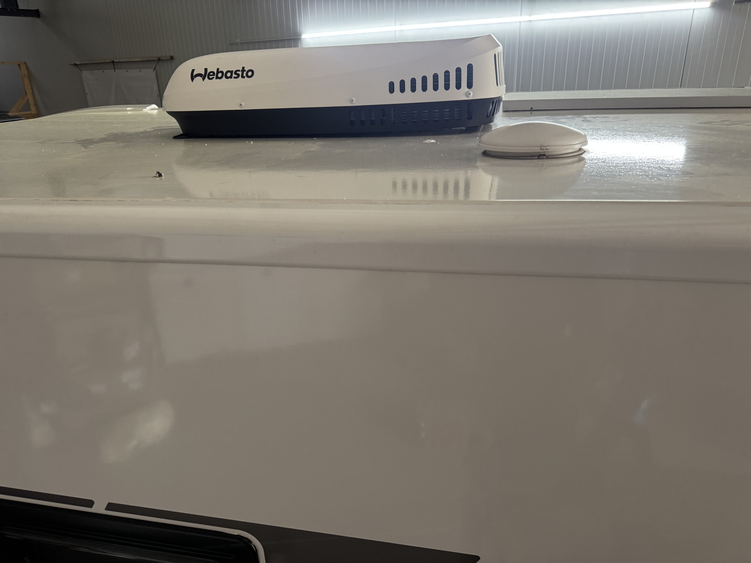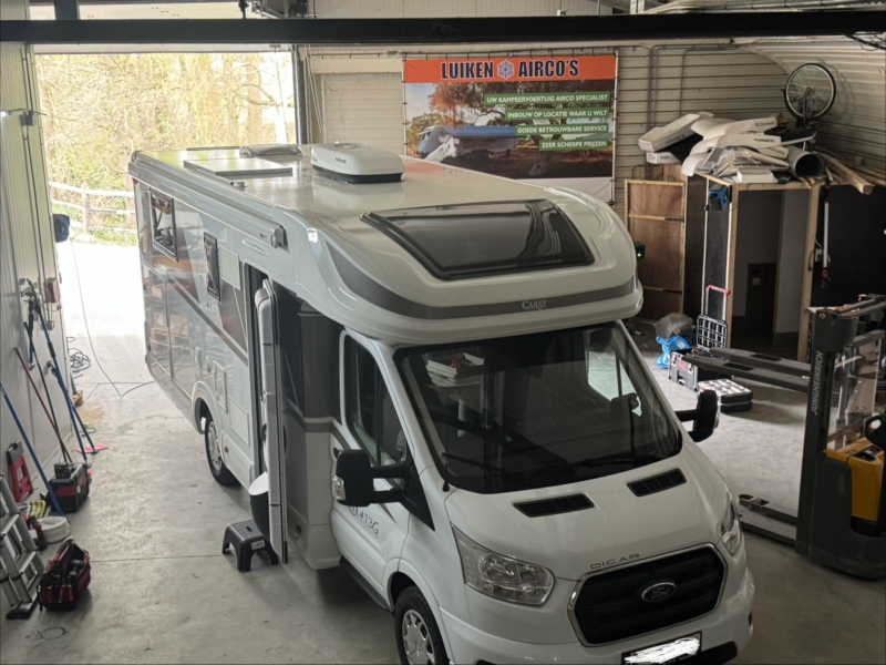Een Webasto Cool Top Trail 24 geplaatst in een McLouis Carat 473G. Het dakraam boven de keuken vervangen voor de dakairco.